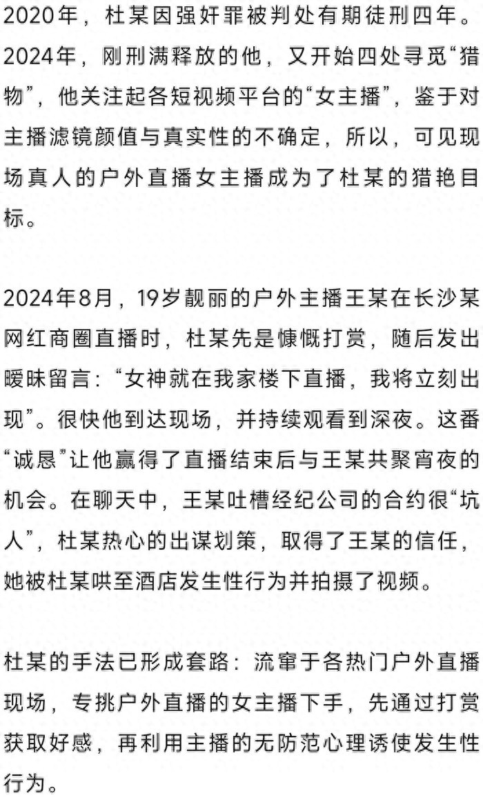 2024年11月,刷着抖音,杜某看到20出头的石某在长沙某繁华商圈进行户外直播,遂前往现场观看,并刷了各种礼物。在现场,杜某混在围观群众中,利用一名携带宠物狗的观众,借“逗狗”诱饵获得石某的关注,逐步降低其防备心理,与之添加好友,并连续几天聊宠物。几天后的深夜,杜某谎称“与朋友在酒店房间内继续饮酒”,邀请石某赴宴、帮忙“挡酒”,石某到达现场,却只见杜某一人,随后杜某采取扼颈等暴力手段,逼迫石某与其发生性关系。